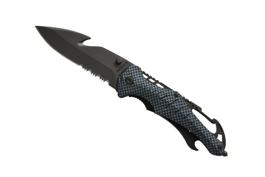 przecinak do taśm i pasów bezpieczeństwa, który pomoże szybko uwolnić osobę poszkodowaną. W dolnej części chowają się kolejno: zbijak do szyb, otwieracz do butelek i karabinek, który posłuży do przytroczenia noża np. W dolnej części chowają się kolejno: zbijak do szyb, otwieracz do butelek i karabinek, który posłuży do przytroczenia noża np.