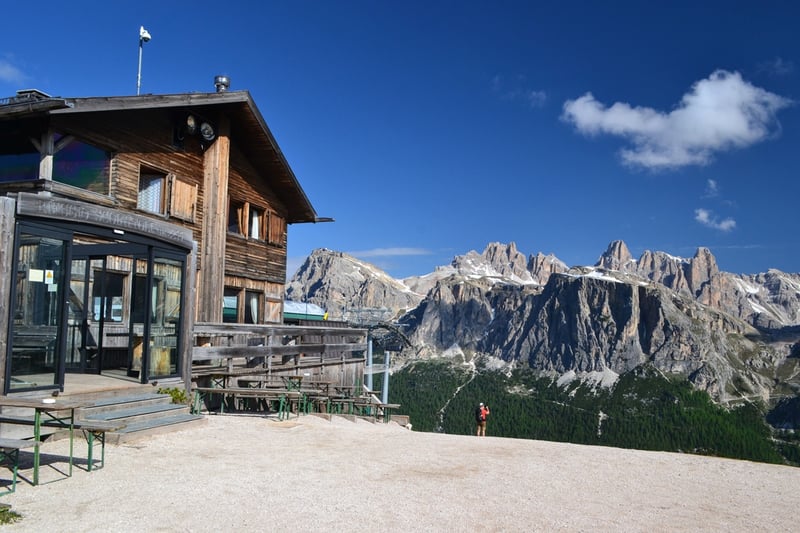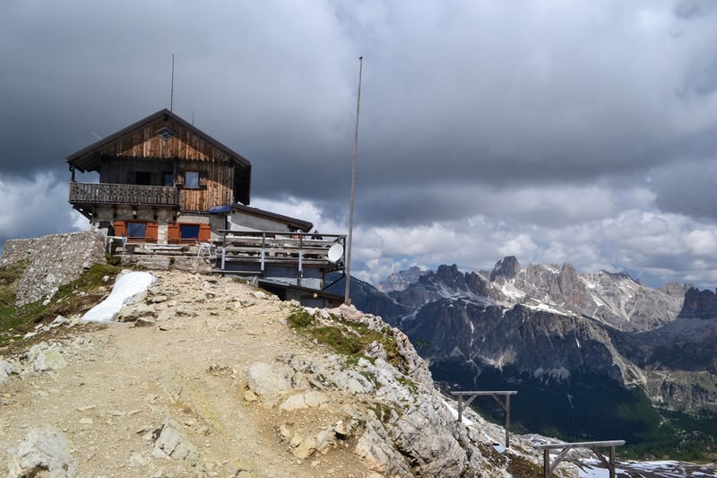 Po krótkiej przerwie wracamy do schroniska Scoiattoli szlakiem 439, skąd odbijamy w lewo ku Rifugio Averau. Teraz czeka nas przyjemny trekking szeroką drogą w otoczeniu śnieżnych zasp, a niecałe 200 metrów przewyższenia zdobywamy w 25 minut. Tym samym znajdujemy się na Przełęczy Nuvolau, położonej na wysokości 2413 m n.p.m. Tutaj otwiera się przed nami widok na południe, ale także możemy obserwować w dole szosę prowadzącą na Passo Giau. Kolejny piękny punkt na trasie. Naszym następnym celem jest oczywiście wierzchołek Nuvolau o wysokości 2575 m n.p.m. i leżące na samym jego czubeczku schronisko. Szlak jest wręcz banalny, wymaga jedynie odrobinkę kondycji i już po 30 minutach można delektować się piękną, szeroką alpejską panoramą.