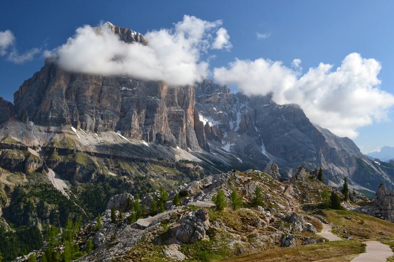 Początkowo szlakiem 424, a później już 440 mamy zamiar wgramolić się na wysokość 2255 m n.p.m. do schroniska Scoiattoli, a później ku masywowi Cinque Torri. Dzień jest cudowny, a wąska ścieżka prowadzi malowniczymi terenami pełnymi różnorodności. Po krótkim odcinku przez las wychodzimy na soczyście zieloną polanę. Kontrastuje ona ze strzelistymi ścianami Dolomitów i nie ma takiej opcji, by nie zatrzymać się na chwilę i nie zbierać szczęki ze zroszonej trawy. Pierwszy etap szlakiem 424 trwa około kwadransa, po czym odbijamy w prawo i zmieniamy numerek na 440. Ścieżka najpierw pnie się znacznie w górę, by po chwili przejść w przyjemny trawers. Między drzewami obserwujemy masyw Tofany i wdychamy poranne rześkie powietrze. Po około 30 minutach wychodzimy na otwarty teren, gdzie naszym oczom ukazuje się nie tylko Cinque Torri wraz ze schroniskiem Scoiattoli, ale również masyw Tofany oraz szczyt Averau i Nuvolau.