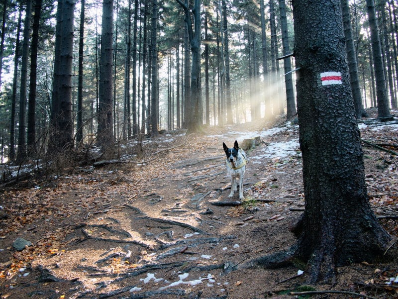 polska klasyka: piękne, zielone, ocienione, bez specjalnych obostrzeń dla psich wędrowców. Nie wejdziemy do Babiogórskiego Parku Narodowego – aczkolwiek na samą Babią Górę można ruszyć od strony słowackiej. W niektórych rejonach można spotkać dziką zwierzynę, toteż warto psa prowadzić na smyczy lub lince.
