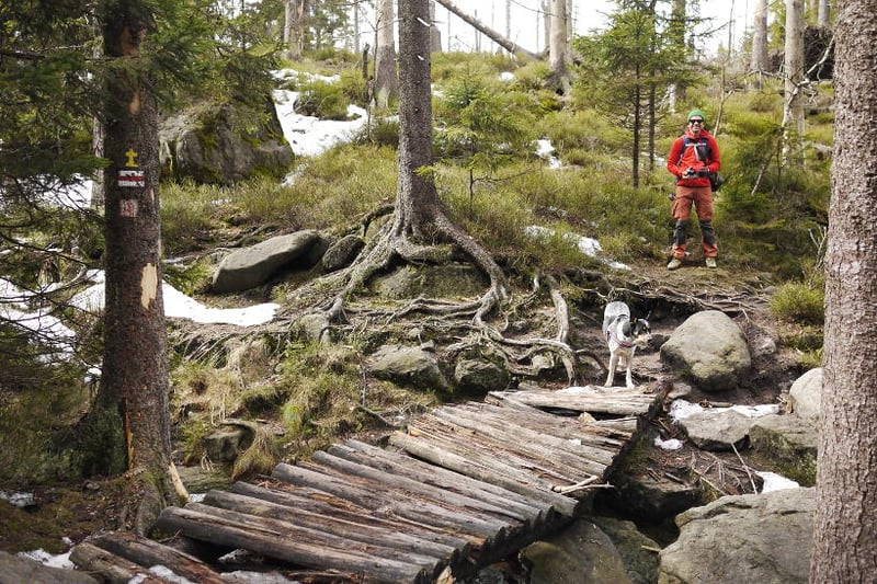 99% szczęścia i radości dla wędrujących z psami: łagodne wzniesienia, długie dystanse, sporo podmokłości . Jednak przewodnik i jego pies nie zrobią sobie pamiątkowego zdjęcia na kilku granitowych wierzchołkach leżących po czeskiej stronie (m.in. Frýdlantské cimbuří, Ořešník, Paličník, Jizera, Sněžné věžičky – chyba że piesek jest na tyle mały, że można bezpiecznie wnieść go na rękach).