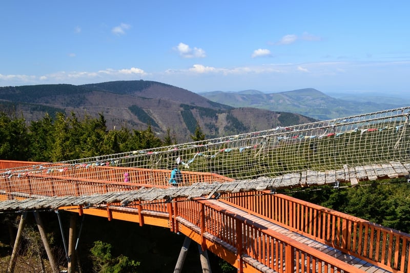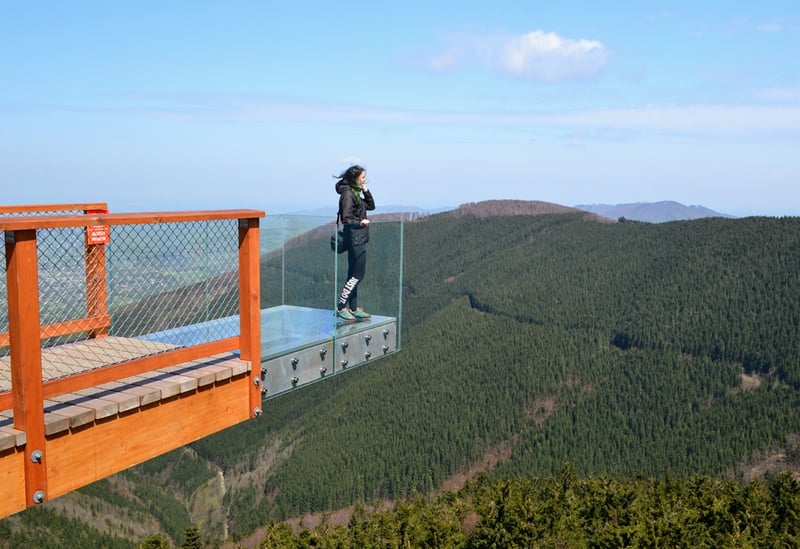 Przed nami pozostał ostatni punkt programu - Stezka Valaška. Jest to nowa atrakcja w Beskidzie Śląsko-Morawskim. Otwarto ją w grudniu 2018 r. po 1,5-rocznej budowie. Ścieżka w koronach drzew jest czynna w sezonie od 9:00 do 18:00, jednak dokładny rozkład najlepiej sprawdzić na stronie https://stezkavalaska.cz/. Koszt wstępu osoby dorosłej to 220 kC (40 zł), a płatności można dokonać także kartą. W takich sytuacjach przydają się portfele i saszetki. Przebywanie na konstrukcji nie jest ograniczone czasowo, spacer odbywa się na wysokości 6-9 m nad ziemią. Po pokonaniu kilku schodów stajemy przed pierwszą atrakcją – Chodnikiem Himalajskim. Pod tą nazwą kryje się wiszący most o długości 135 m, udekorowany modlitewnymi chorągiewkami oznaczającymi niebo, wodę, ogień, ziemię i powietrze. Most jest solidną konstrukcją na stalowych linach, choć trzeba się przygotować na niemałe kołysanie. Po pokonaniu pierwszego odcinka idziemy krętą drogą na 22-metrową wieżę. Punktem kulminacyjnym budowli jest Skywalk, czyli szklany balkon z przezroczystą podłogą zawieszony na wysokości 30 metrów. Na widokówce może przebywać zaledwie 5 osób, a pierwsze wejście na podest powoduje delikatne przyspieszenie bicia serca.