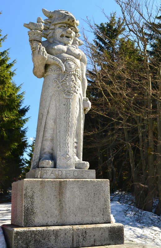 Niebawem ruszamy w kierunku Radegasta, który posiada aż 3 wierzchołki. Najpierw musimy wrócić do rozstaju, a potem kontynuujemy wędrówkę szeroką drogą. Szlak niebieski prowadzi widokowym grzbietem, a marsz jest wciąż niewymagający. Idealna trasa biegowa, rowerowa czy skiturowa. Po 15 minutach docieramy na środkowy wierzchołek Radegasta. Oferuje on widok nie tylko na pasmo Jaworników, ale również Ondrejnik, Łysą Górę oraz Pustevny i Ścieżkę Valaška. Po kilku minutach osiągamy ostatni wierzchołek, gdzie znajduje się charakterystyczny pomnik słowiańskiego bóstwa Radogosta. Według wierzeń był bogiem słońca i ognia. Legenda również głosi, że Cyryl i Metody mieli zburzyć jego pomnik, ale jak widać, ten stoi niewzruszony. Na miejscu można zakupić oczywiście piwo Radegast i spożyć je w towarzystwie bóstwa.