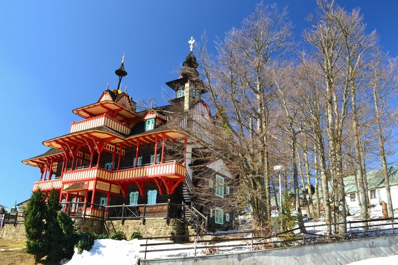 Słowacki Raj i Suchá Belá – roklina nadziewana atrakcjamiWkrótce kontynuujemy wędrówkę w kierunku przełęczy Pustevny, od której dzieli nas zaledwie 1,5 km. Wciąż szeroki trakt prowadzi nieznacznie w dół, a na miejscu zastajemy masę turystów, parking, górną stację kolejki, restauracje, bary i kompleks schronisk turystycznych autorstwa Dušana Jurkoviča. Mimo wszystkich negatywnych odczuć pogoda jest wspaniała, więc siadamy w jednej z knajpek i popijamy zimną kofolę.