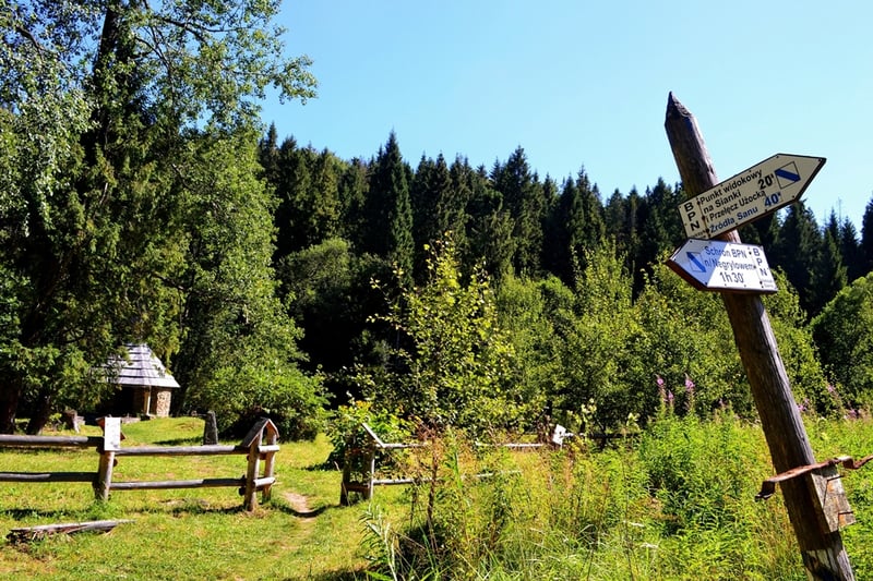Gdzie w Bieszczady Ukraińskie? Bieszczadujemy w ZakarpaciuZnaki informują nas o poruszaniu się tylko wyznaczoną ścieżką ze względu na granicę państwa, a my podążamy przez malownicze tereny Doliny Górnego Sanu. Pierwszy odcinek prowadzi przez malownicze łąki, natomiast drugi wśród drzew. Tam jest kres naszej wędrówki. Na miejscu znajduje się charakterystyczny obelisk, na którym podane są współrzędne geograficzne (sprawdź kompasy), wysokość bezwzględna oraz długość Sanu. Co ciekawe, znajdujemy się zaledwie kilkaset metrów od Przełęczy Użockiej, ale niestety pokonanie jej jest nielegalne. Wielka szkoda, ponieważ stamtąd wiedzie zielony szlak na szczyt Opołonek, który jest najdalej wysuniętym na południe punktem Polski.