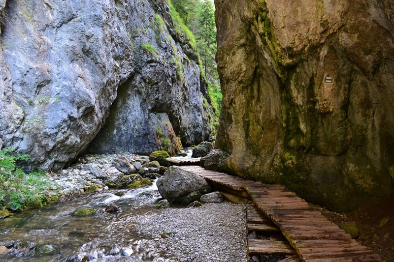 Góry Słowacji – Mała Fatra od południaBy kontynuować wędrówkę najpierw wracam do rozstaju, a po pokonaniu kilkunastu metrów wchodzę w wąwóz Sokół. Przede mną wyrasta ciąg drabinek usytuowanych między skalnymi ścianami, a ciekawostką jest, że po większych opadach w kanionie również pojawia się woda i niewielkie kaskady. Odcinek jest niesamowicie klimatyczny - ciasny wąwóz ze skałami porośniętymi mchem, delikatny chłód i magiczne echo.