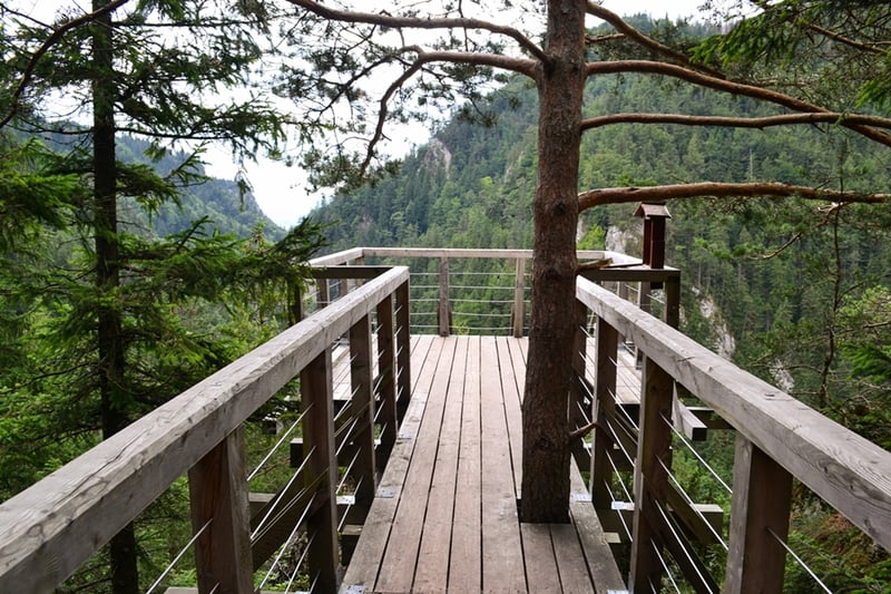 Za co pokochasz butelki Hydro FlaskZa młynami obieram szlak czerwony i wciąż Doliną Kwaczańską kontynuuję wędrówkę. Nie muszę długo czekać na kolejną atrakcję, gdyż po 15 minutach umiarkowanego podejścia znajduję się na szczycie Mały Rohacz. Tu przygotowano dla turystów vyhliadkę, czyli pomost widokowy. Mam szczęście przebywać na konstrukcji sama, a podziwiać z niej można porośnięte lasem kopy oraz kanion i rzekę daleko w dole. Miejsce ciekawe, a platforma oryginalna.