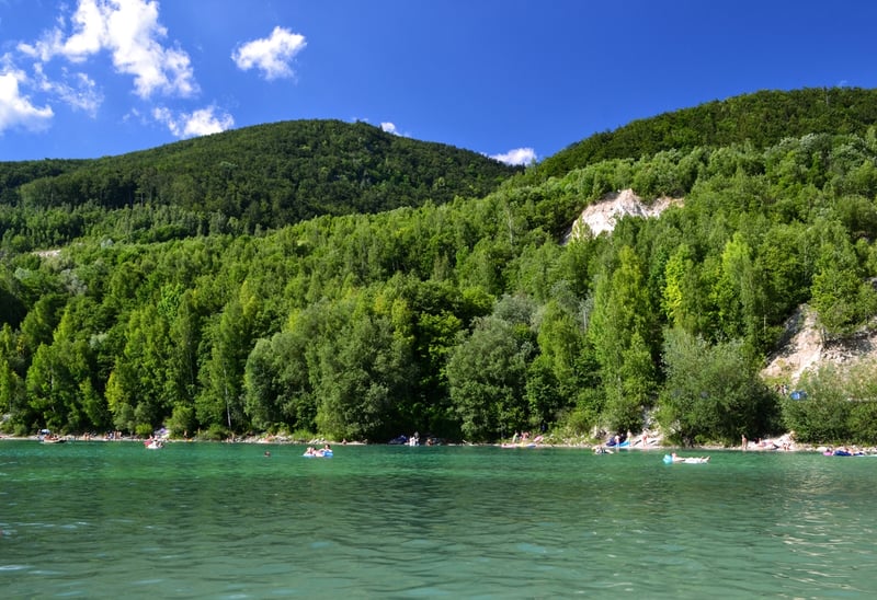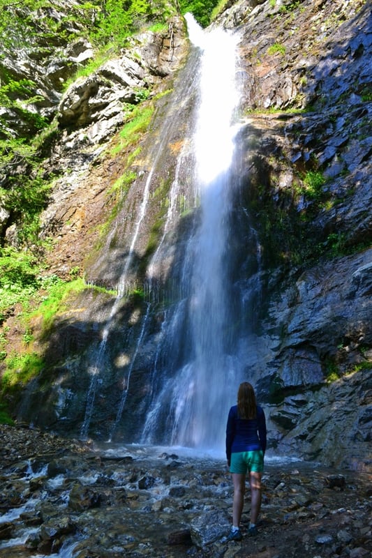 Naszą pętlę rozpoczniemy w miejscowości Šútovo, która słynie przede wszystkim z jeziora powstałego z zatopienia kamieniołomu. Jezioro zostawiamy sobie na deser, a tymczasem o poranku obieramy szlak niebieski i udajemy się do Szutowskiego Wodospadu, który jest największą kaskadą w Małej Fatrze. Tabliczki wskazują 1 h 20 min do celu, a droga na całej długości 4,5 km prowadzi lasem wzdłuż potoku. Podejście jest umiarkowane, nie przysparza trudności, ale jest nadzwyczaj nudne. Po upływie 60 minut docieramy do węzła szlaków i dosłownie na moment zbaczamy z niebieskiej ścieżki, by dostać się do wodospadu. Trzeba przyznać, że 38-metrowa kaskada robi wrażenie i wcale nas nie dziwi, że Šútovský Vodopád przyciąga tylu turystów.