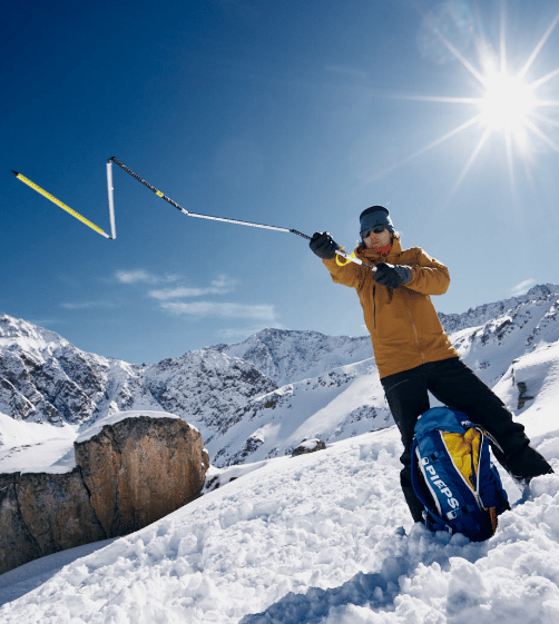 - Oznaczenia głębokości: Prawie każda sonda lawinowa ma na swojej rurze wydrukowane oznaczenia długości. Te pomiary są pomocne do określenia głębokości śniegu podczas sondowania oraz do badania warstw śniegu lub do szybkich ocen sytuacji.