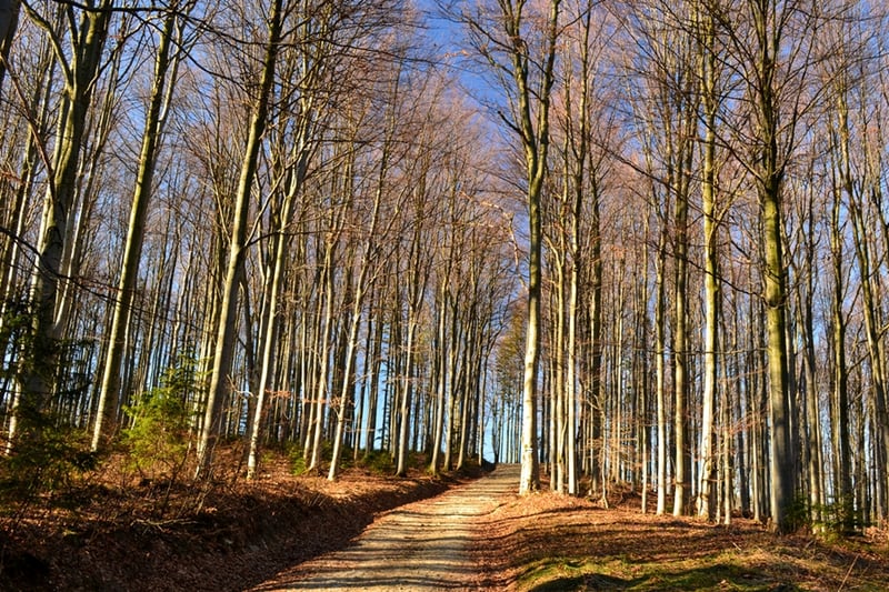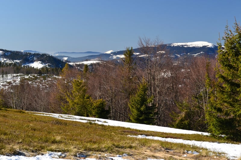 Znajdujemy się obecnie na 775 m n.p.m., zupełnie nie kodując, że czeka nas około 350 metrów przewyższenia na odcinku 2 kilometrów. Na początku zanosi się oczywiście niepozornie. Szlak biegnie lasem umiarkowanie w górę, czuć pierwszy powiew wiosny, świergot ptaków i zupełną pustkę. Po 20 minutach docieramy na Polanę Krawcową, która pomimo nazwy jest kompletnie pozbawiona widoków, ponieważ z roku na rok zarasta. Wędrówkę kontynuujemy niebieskim szlakiem, który zapowiada 40 minut na szczyt.