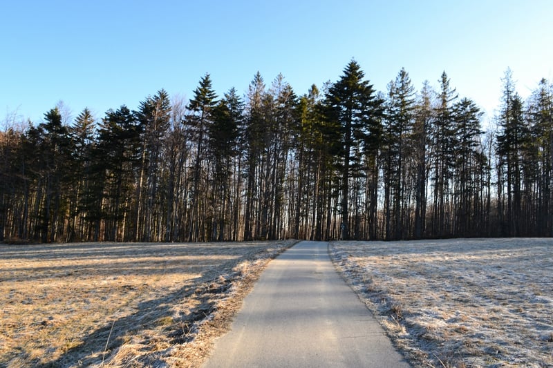 Zaplanowaliśmy pętlę z ostatniego osiedla za Koszarawą-Cichą, gdzie pod lasem, niedaleko pola namiotowego, nieopodal osady Pustelniki znajduje się niewielki parking. Stamtąd startuje szlak zielony, którym będziemy schodzić, oraz czerwona droga rowerowa, którą początkowo będziemy wchodzić. Odnalezienie wspomnianego parkingu, nawet z nawigacją, było nie lada wyzwaniem, ale finalnie o 7:30 wkraczamy na szlak. Najpierw czeka nas odcinek drogą asfaltową przez osiedle Jałowiec. Kilometrowe podejście jest całkiem solidne i zajmuje nam 20 minut. Doprowadza na Przełęcz Cichą, czyli interesujący nas szlak niebieski.