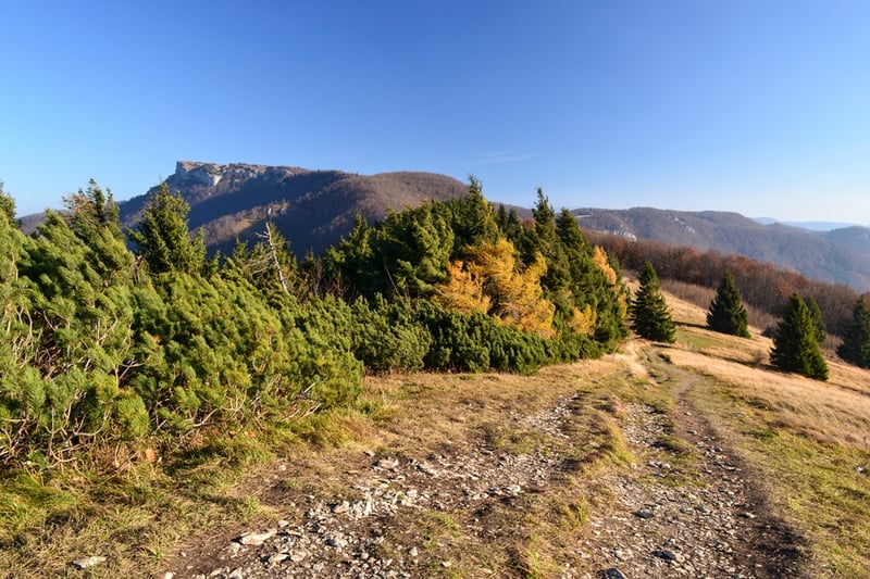 Trzeci etap szlaku żółtego to wędrówka praktycznie po równym terenie, głównie buczynowym lasem. Szlak początkowo prowadzi szeroką drogą umiarkowanie w górę, by potem kluczyć wąską ścieżką między drzewami. Chodnik usłany jest różnobarwnymi liśćmi, które przyjemnie szeleszczą pod butami. Od rozstaju „Pod skałą” maszerujemy już skalistym terenem, co nieuchronnie zwiastuje zbliżanie się do szczytu. Zwiastunem wierzchołka jest również wzmagający się wiatr, a pusta kopuła szczytowa oznacza tylko jedno - nie da się na niej usiedzieć.