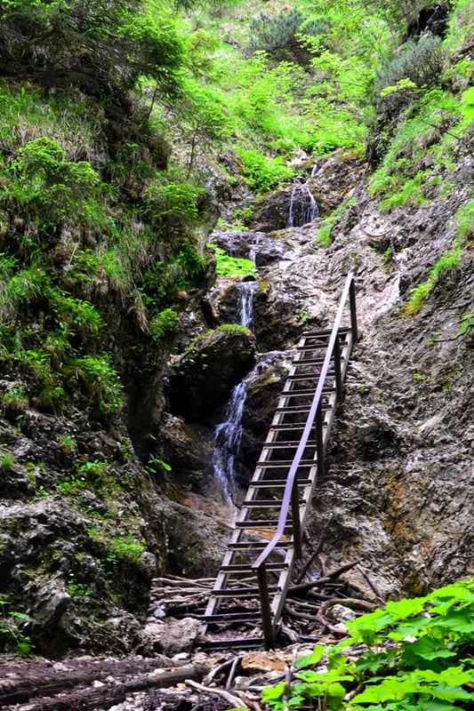 Na przełęczy do wyboru są dwa warianty – szlak zielony prowadzący lasem lub wariant niebieski, który wiedzie malowniczym wąwozem Janosikowe Diery. Oczywiście druga opcja jest zdecydowanie ciekawsza, ponieważ diery to system wąskich, krętych wąwozów głęboko wyciętych w wapiennym podłożu. Wędrówka odbywa się po metalowych pomostach i drabinkach, które ułatwiają pokonanie kanionu, a szum potoku, liczne wodospady i bliskość skalnych ścian robią spore wrażenie. Po około 40 minutach opuszczam wąwóz, skąd czeka mnie jeszcze 10 minut marszu na Sedlo Medzirozsutce.