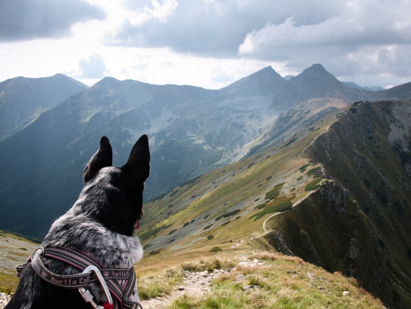 Pies w górach nie potrzebuje wymyślnego sprzętu, jednak im poważniejszy teren lub mniej okiełznane stworzenie, tym bardziej przydać się mogą wyspecjalizowane szelki (jak np. Ruffwear Web Master Harness). Na zdjęciu Kuata w Tatrach Bielskich.