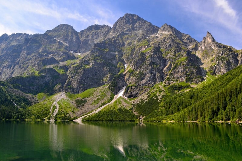 By dostać się na przełęcz o oryginalnej nazwie, trzeba najpierw pokonać 8-kilometrową asfaltówkę do Morskiego Oka. Jedni lubią, inni nienawidzą, dla nas dziś jest tylko pierwszym etapem wędrówki. Po niecałych dwóch godzinach docieramy nad brzeg jeziora, a poranne widoki są obłędne. Słońce doskonale oświetla taflę stawu. Do tego dochodzi letni, zielony krajobraz i od razu staje się jasne, dlaczego właśnie Morskie Oko uchodzi za najpiękniejsze jezioro w Tatrach.