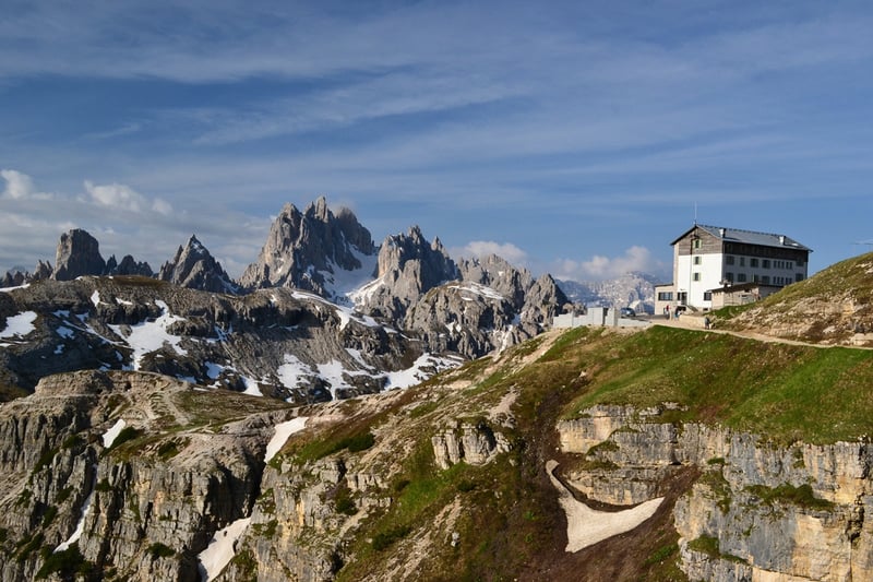 Od Rifugio Locatelli dzieli mnie około 1,5 kilometra, które pokonam również szeroką, bitą drogą. Od strony północnej Trzy Siostry wyglądają imponująco, ale to, co mnie zaskakuje po tej stronie masywu, to ilość śniegu w czerwcu. Jestem na wysokości około 2400 metrów, a zaspy obok szlaku mnie przerastają. Dobrze, że miałam raki. Kilka odcinków trzeba co prawda pokonać po zmarzniętych płatach, ale całość jest raczej nieźle odśnieżona. Po około 40 minutach wreszcie staję przed schroniskiem, które również otwarte jest od końca czerwca do końca września. Wokół mnie piętrzą się skalne iglice, a panorama jest fenomenalna.