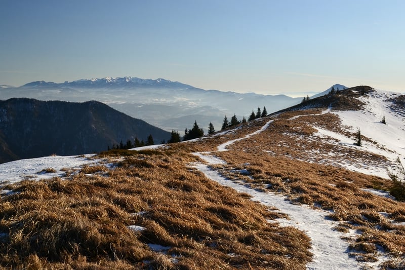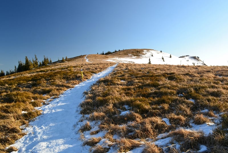 Jak wybrać kije trekkingowe?Śnieg z jej zboczy jest kompletnie wywiany, a zamiast białego podłoża obserwujemy spaloną słońcem i skutą mrozem trawę. Na ścieżce zalega jednak lód, po którym poruszamy się trochę jak poranni imprezowicze, idący szlakiem węża. To ponownie zasługa mocnych podmuchów wiatru. Jednak wszystkie te błahostki nie mogą równać się z widokami, które ukazują się naszym oczom. Im jesteśmy wyżej, tym panorama bardziej rozpieszcza.