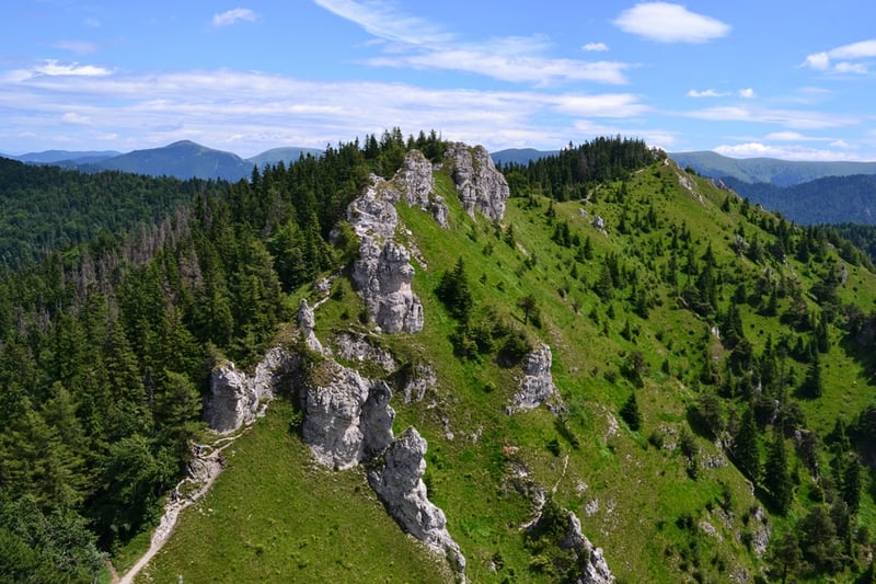 Cała Wielka Fatra jest wręcz na wyciągnięcie ręki, a strome zbocza dodają temu miejscu charakteru. Z przełęczy na szczyt prowadzi wąska ścieżka, głównie grzbietem, ale zdarzają się też krótkie trawersy. Południowe stoki góry są strome, choć ich srogie oblicze łagodzi porastająca trawa i roślinność. Ostatni etap jest najbardziej ekstremalny. Tworzą go kamienno-drewniane schody, a ciąg łańcuchów ma za zadanie ułatwić podciąganie, choć i bez można sobie sprawnie poradzić. Na końcu czeka skalne okno, przez które trzeba się przecisnąć na drugą stronę, a potem pozostaje krótki trawers na szczyt. Z wierzchołka tym razem obserwuję niedawno zdobytą Tłustą i całą gamę okolicznych szczytów. Warto było się wdrapać.