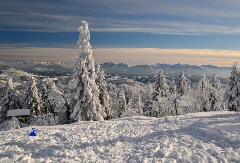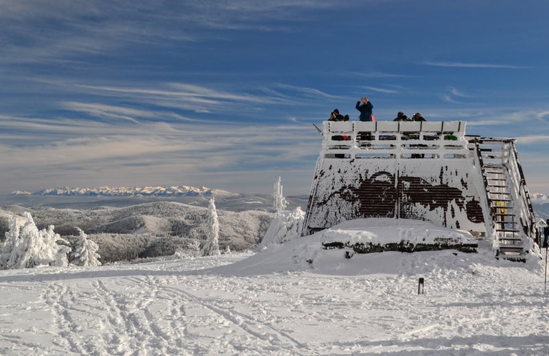 Wielka Racza jest wierzchołkiem granicznym o wysokości 1236 m n.p.m. Choć góra jest w większości zalesiona, to na szczycie znajduje się naturalna hala, dzięki której można podziwiać panoramę 360°. To, co dzisiaj zastajemy na miejscu, przerasta nasze najśmielsze oczekiwania. Zmierzamy wolnym krokiem na wieżę widokową, ale to tylko formalność. Panorama na Tatry, Tatry Niżne, Małą Fatrę oraz cały arsenał beskidzkich wzgórz to coś, czego kompletnie się nie spodziewaliśmy. W ogóle na Wielkiej Raczy, choć byłam tyle razy, nie było dane mi zobaczyć tak dalekich i różnorodnych krajobrazów. Delikatny mróz i popołudniowe słońce wpływają genialnie na przejrzystość powietrza, więc pozostaje tylko stać na szczycie i beztrosko gapić się przed siebie.