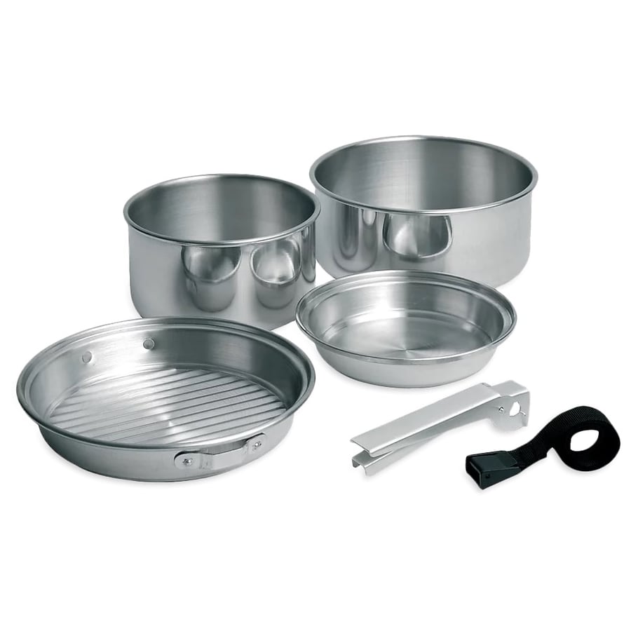 Aluminiowy zestaw 5 lekkich garnków turystycznych. Idealny na trekking czy kemping. Dzięki dołączonemu paskowi zestaw można łatwo złożyć do kompaktowych rozmiarów.