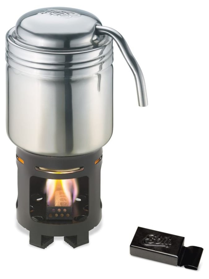 200ml (wyposażony w zawór bezpieczeństwa i odpowiednie sitko) oraz podstawa umożliwiająca korzystanie ze stałego paliwa Ebit, będąca jednocześnie osłoną płomienia. Po napełnieniu dolnej części czajniczka wodą, nałożone zostaje na nią sitko filtrujące ze zmielona kawą, a całość zamykana jest od góry pojemnikiem na gotowy już napar. Powstająca podczas gotowania para przechodzi pod ciśnieniem przez kawę w sitku, dając wprost do filiżanki kawę o charakterystycznym aromacie, doskonale przefiltrowaną, pokrytą delikatną warstwą jasnobrązowej pianki.Dla oszczędności miejsca cała podstawa ekspresu może zostać schowana na czas transportu do jego wnętrza.. Powstająca podczas gotowania para przechodzi pod ciśnieniem przez kawę w sitku, dając wprost do filiżanki kawę o charakterystycznym aromacie, doskonale przefiltrowaną, pokrytą delikatną warstwą jasnobrązowej pianki.Dla oszczędności miejsca cała podstawa ekspresu może zostać schowana na czas transportu do jego wnętrza..