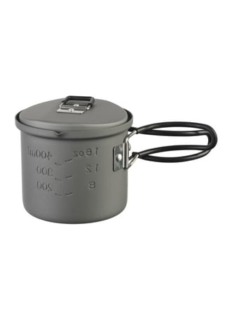 Turystyczny garnek z anodyzowanego aluminium. Uchwyty ze stali nierdzewnej, wykończone silikonem chroniącym przed poparzeniami.