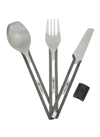 Wygodna i kompaktowa konstrukcja sztućców powstała z lekkiego tytanu. W skład zestawu wchodzą nóż, widelec i łyżka. Wszystkie elementy spięto praktycznym zaciskiem zapobiegającym ich utracie. Część chwytną pokryto antypoślizgowym silikonem.