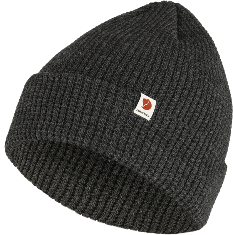 Fjallraven Tab Hat to miękka i wygodna czapka z dzianiny poliestrowej z recyklingu. Szeroko wywinięty dolny brzeg ma naszywkę tekstylną z logo marki. Czapka odprowadza wilgoć i szybko schnie, dzięki czemu sprawdzi się zarówno na co dzień, jak i w górach.