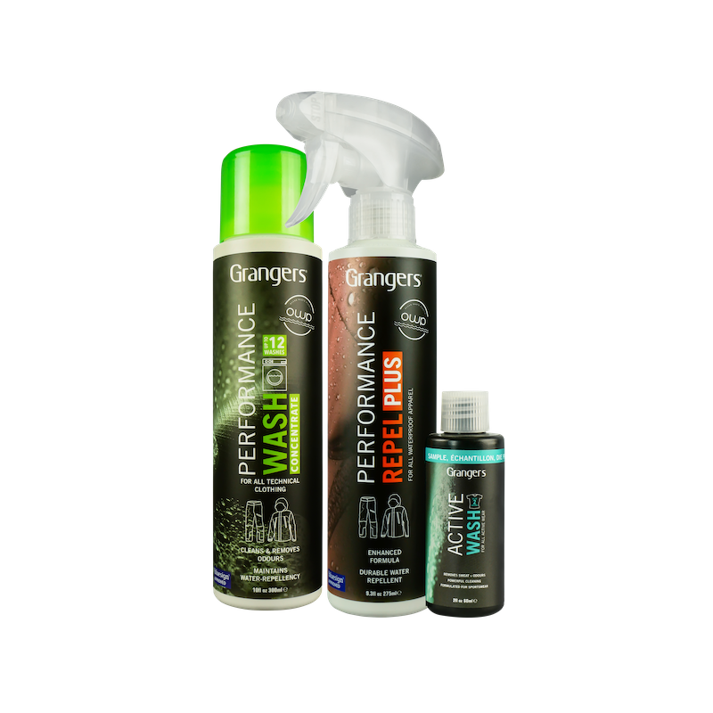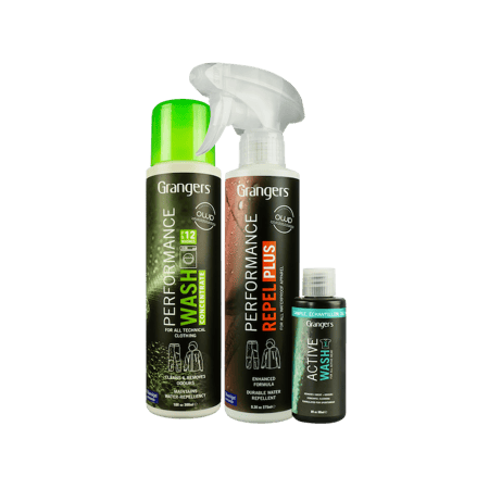 Zestaw 3 produktów, którymi wypielęgnujesz odzież turystyczną. Performance Wash czyści odzież zwykłą i membranową, Performance Repel Plus w atomizerze impregnuje odzież z membraną, a płyn Active Wash odświeża bieliznę.