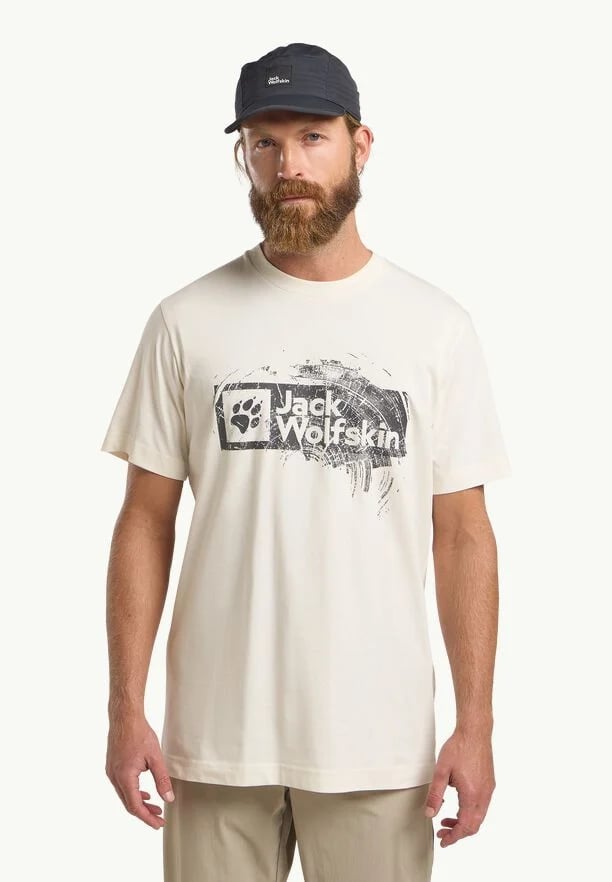 Koszulka męska BRAND T M od Jack Wolfskin to wygodna odzież wykonana z miękkiej bawełny organicznej, idealna na co dzień oraz do relaksu po wędrówkach.
