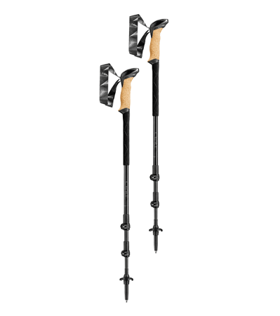 Regulowane kijki trekkingowe z rękojeścią z naturalnego korka. Leki Black Series Carbon wykonano z włókna węglowego i aluminium, dzięki czemu są bardzo stabilne i wytrzymałe.