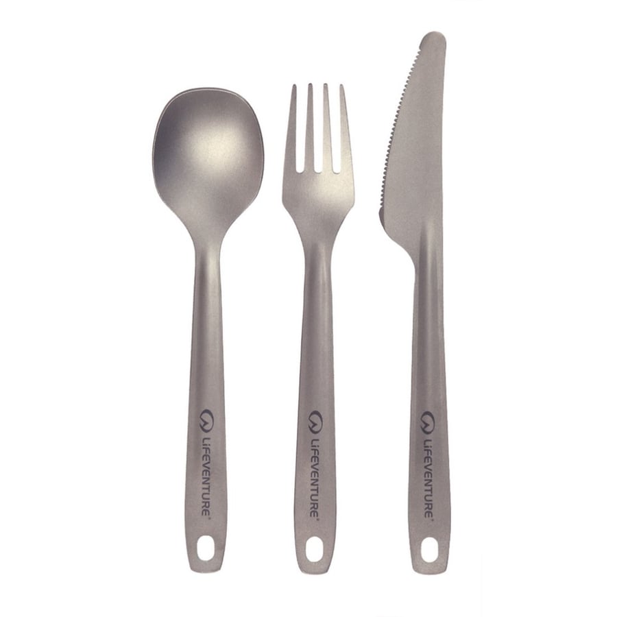 Zestaw sztućców Titanium składa się z lekkiego noża, widelca i łyżki wykonanych ze stopu tytanu przeznaczonego do kontaktu z żywnością. Mocniejsze niż stal i prawie o połowę lżejsze, złączone poręcznym karabińczykiem.