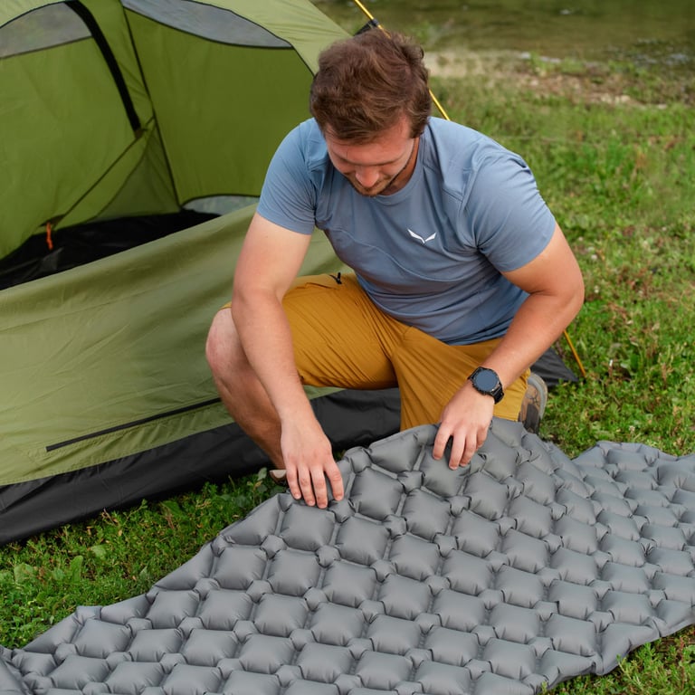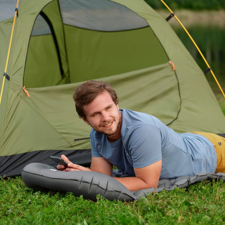 Materac trekkingowy Shela wykorzystuje przemyślaną konstrukcję komorową, która sprawia, że materac dopasowuje się do kształtu ciała i równomiernie rozkłada ciężar użytkownika. To znaczy: mniej punktowego nacisku, mniejsze ryzyko zdrętwiałych kończyn i spokojniejszy sen.