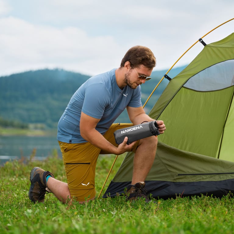 Po spakowaniu materac do namiotu Shela ma tylko 27 × 9 × 9 cm – wielkość zbliżoną do butelki wody. Taki rozmiar oznacza, że materac bez problemu zmieścisz w bocznej kieszeni plecaka, sakwie rowerowej czy większej torbie podręcznej. Do zestawu dołączono także poręczny worek transportowy, który ułatwia pakowanie i chroni materac przed zabrudzeniem.