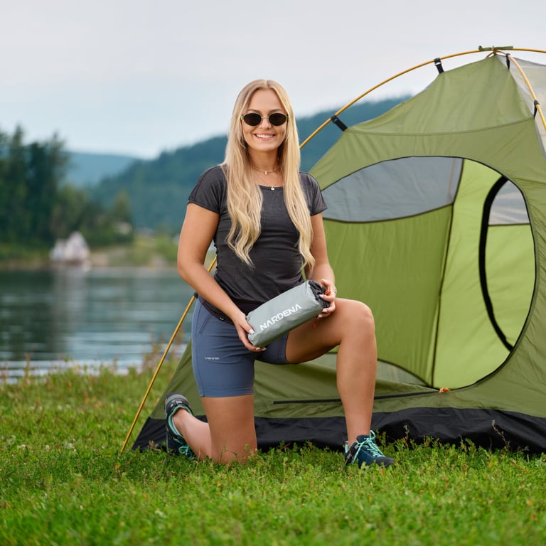 Po spakowaniu materac do namiotu Shela ma tylko 27 × 9 × 9 cm – wielkość zbliżoną do butelki wody. Taki rozmiar oznacza, że materac bez problemu zmieścisz w bocznej kieszeni plecaka, sakwie rowerowej czy większej torbie podręcznej. Do zestawu dołączono także poręczny worek transportowy, który ułatwia pakowanie i chroni materac przed zabrudzeniem.