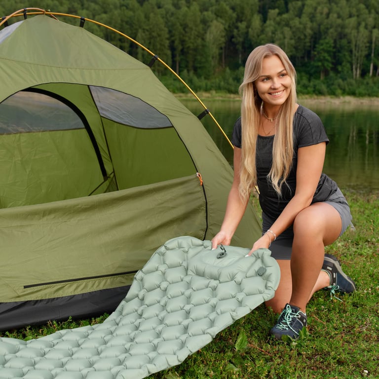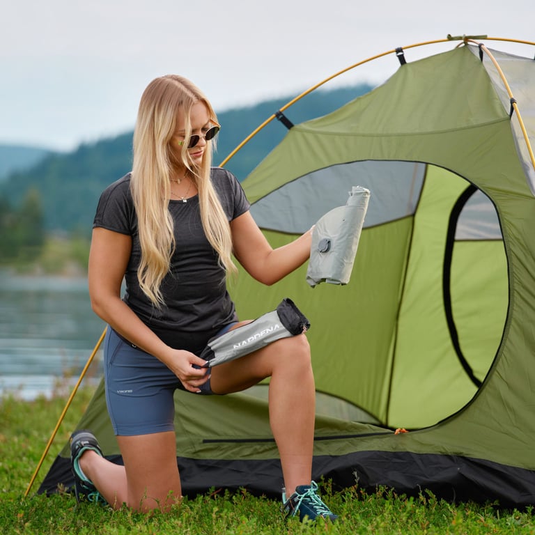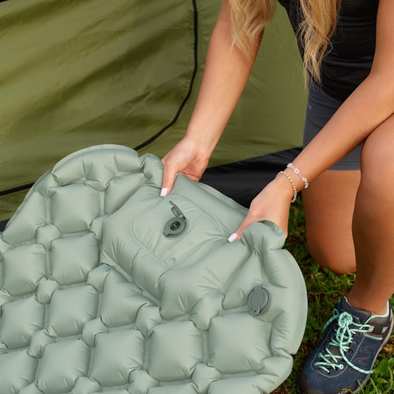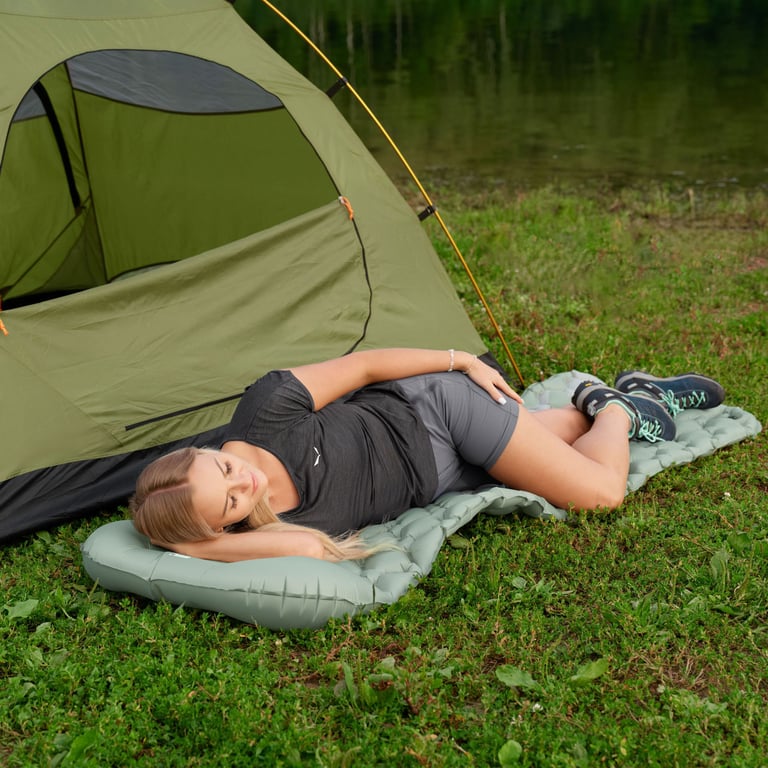 Lekki materac turystyczny Shela ze zintegrowaną poduszką i zaworem zwrotnym to świetny wybór na trekkingi, biwaki i campingi.