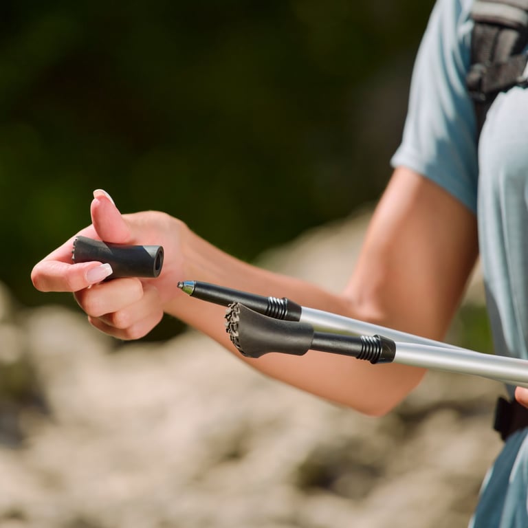 W zestawie znajdują się nakładki z TPR (termoplastycznej gumy) oraz talerzyki letnie, które zwiększają wszechstronność kijków. Nakładki zapewniają dodatkową przyczepność i chronią końcówki podczas marszu po twardych nawierzchniach, a talerzyki zapobiegają zapadaniu się kijków w miękkim terenie – np. na piasku lub leśnej ściółce. To praktyczne akcesoria, które pozwalają korzystać z kijów przez cały rok.