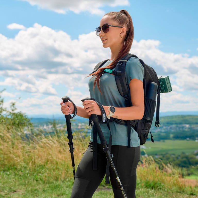 Składane kije trekkingowe Himala z żyłkową konstrukcją wesprą na górskich szlakach i podczas szybkiego marszu.