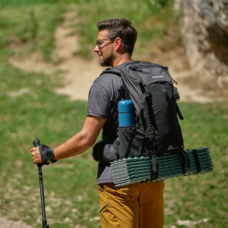 Udane trekkingi z plecakiem turystycznym Grenom 40. Wyposażony w wentylowany panel tylny, gwizdek bezpieczeństwa i pokrowiec przeciwdeszczowy.