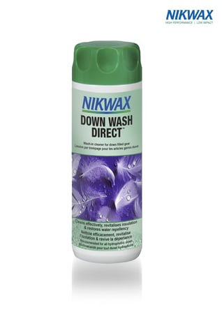 Down Wash Direct® marki Nikwax to pierwszy środek pielęgnacyjny, który został specjalnie zaprojektowany do optymalizacji działania normalnej, jak i hydrofobowej odzieży puchowej. Ten bardzo łatwy w aplikacji produkt sprawia, że pielęgnacja zarówno nie poddanej jeszcze temu procesowi jak i już zaimpregnowanej odzieży puchowej oraz śpiworów jest dziecinnie prosta. Ten produkt uzyskał nagrodę w 2015 na międzynarodowych targach we Friedrichshafen.