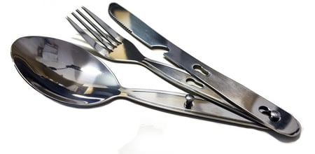 Turystyczny zestaw stalowych sztućców niezbędnych podczas każdego posiłku. W zestawie są łyżka, widelec oraz nóż z otwieraczem do butelek. Wszystkie elementy składają się w komplet, który nie rozpadnie się w plecaku i zawsze będzie pod ręką. Dodatkowo w zestawie znajduje się przezroczyste etui na sztućce.