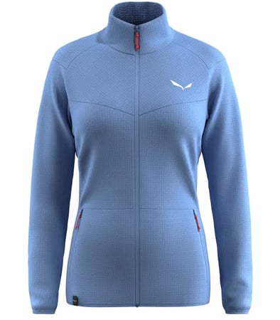 Bluza damska Salewa Puez Cammino Pl Hz Jkt W morning blue to lekka i funkcjonalna damska bluza, zaprojektowana z myślą o całorocznych aktywnościach górskich. Wykonana z materiału Polarlite Grid zapewnia doskonałą izolację termiczną przy jednoczesnym zachowaniu niskiej wagi i kompaktowych rozmiarów po spakowaniu. Wewnętrzna struktura siateczki wspomaga odprowadzanie wilgoci i poprawia cyrkulację powietrza, co zwiększa komfort podczas intensywnego wysiłku. Dzięki elastycznemu materiałowi i dopasowanemu krojowi, zapewnia swobodę ruchów, czyniąc ją idealnym wyborem jako warstwa pośrednia w chłodniejsze dni.